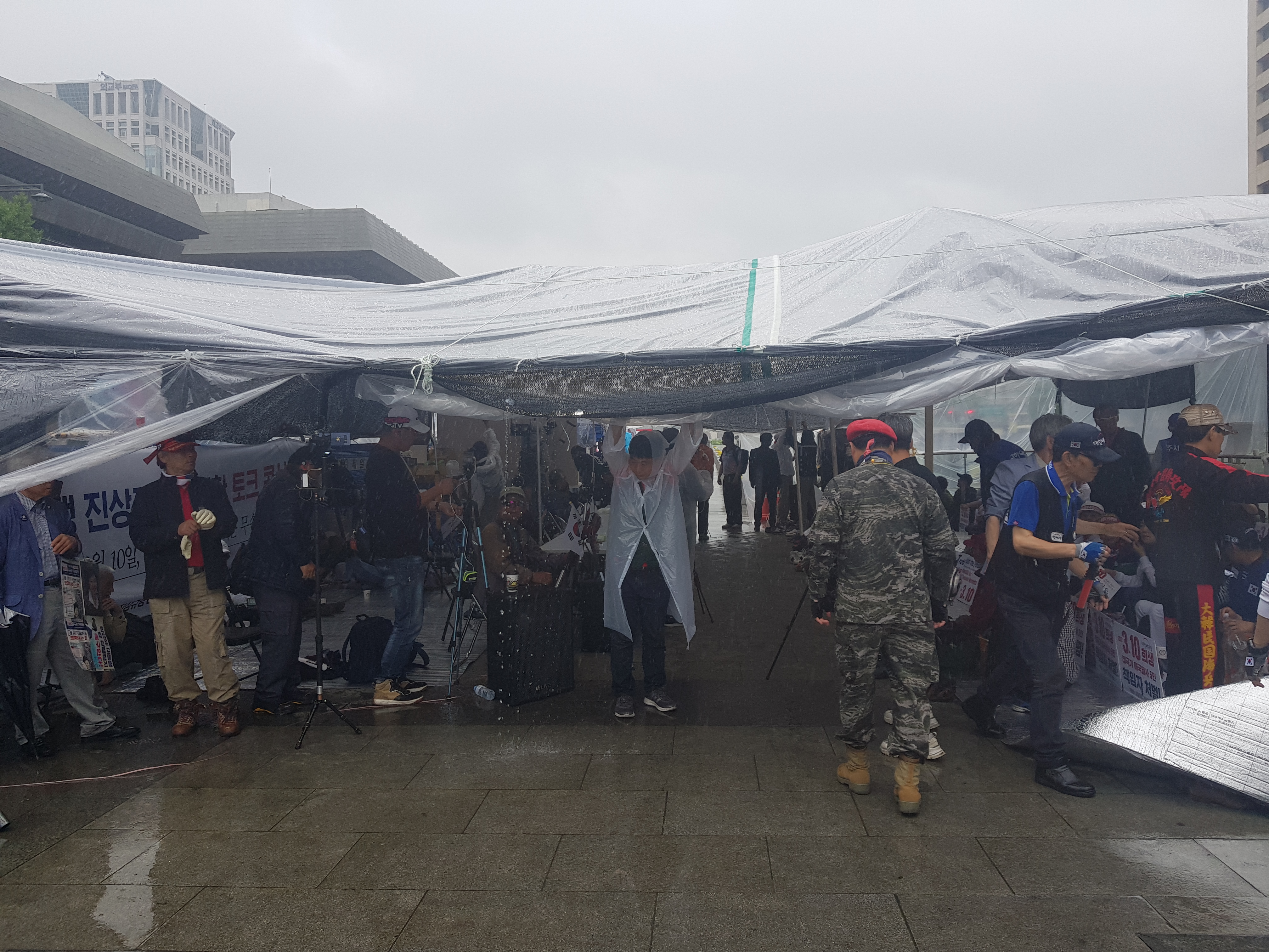 광화문 광장에 고인 빗물이 바닥 안으로 파고들면서 스며들었다. 바닥에는 스치로 폴 등을 깔았지만 소용없었다. 스치로 폴 사이 사이로 빗물이 스며들었다. 자리에 앉으니 바지에 금새 물자국이 배었다.